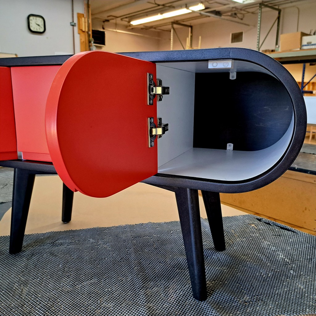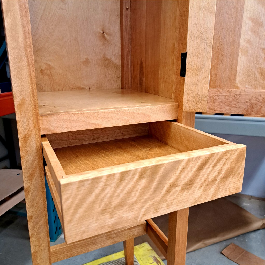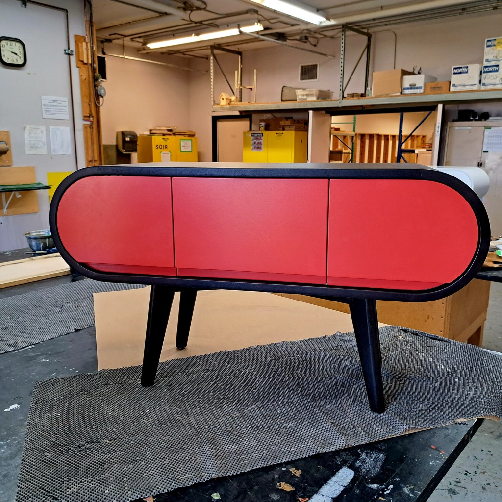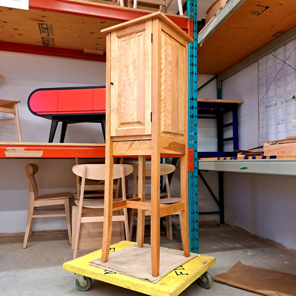 Dans le cadre de mes études à l’École Nationale du Meuble et de l’Ébénisterie de Montréal (E.N.M.E.), j’apprends à fabriquer des meubles que ce soit de façon traditionnelle avec des outils manuels portatifs et / ou avec de la machinerie fixe telle que bancs de scie, dégauchisseuses, scies radiales, à onglets, affleureuses, toupies, shapers, raboteuses, tenonneuses, mortaiseuses, ponceuses de chants… Les bois massifs utilisés sont de l’érable, du merisier, du frêne ou du pin en fonction de l’approvisionnement de l’école et des prix du marché.