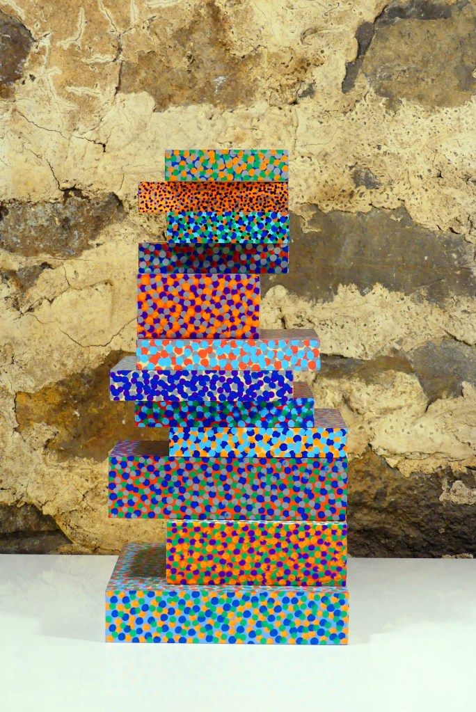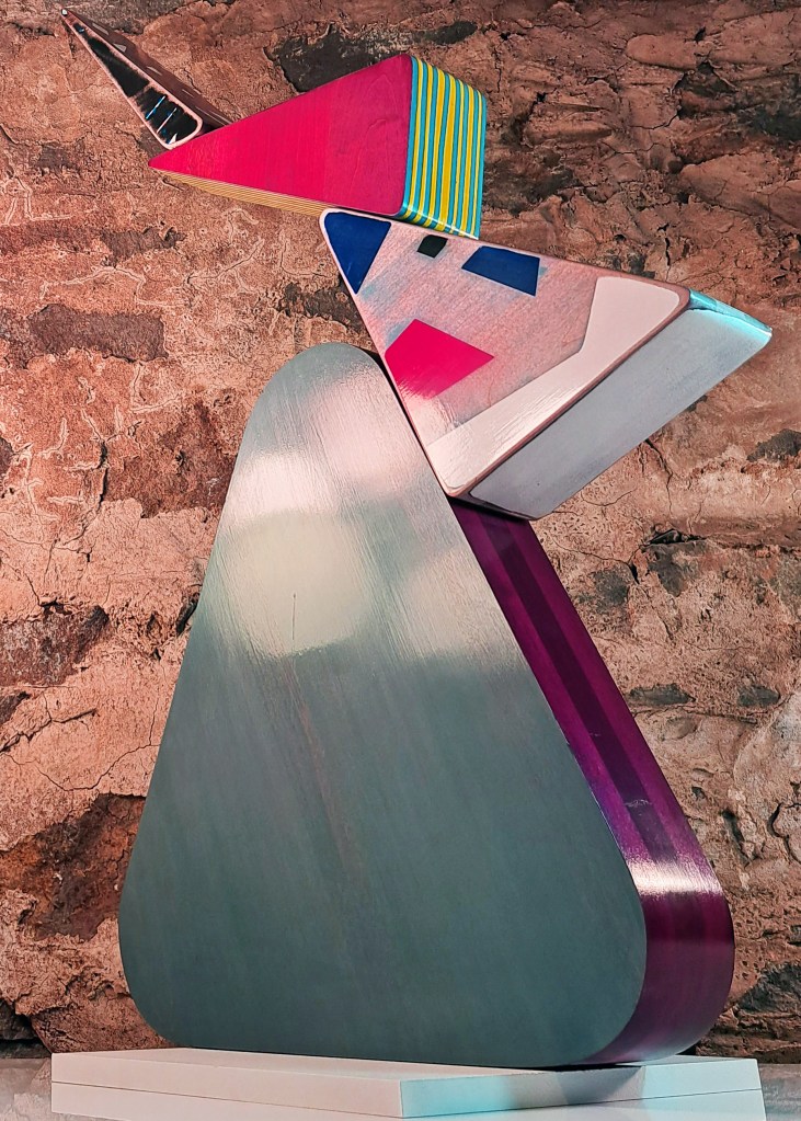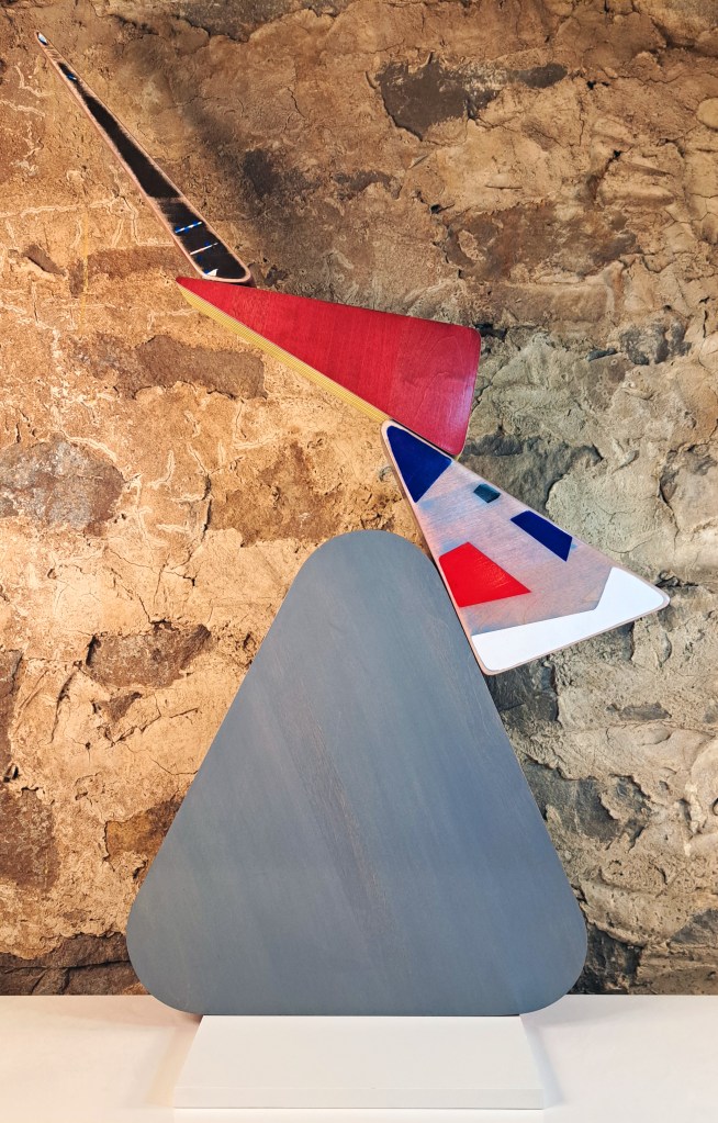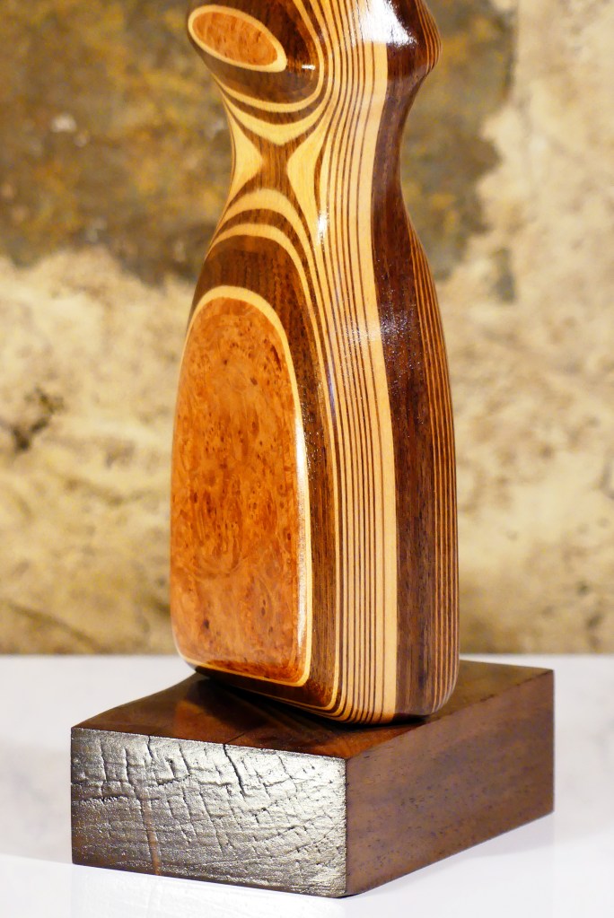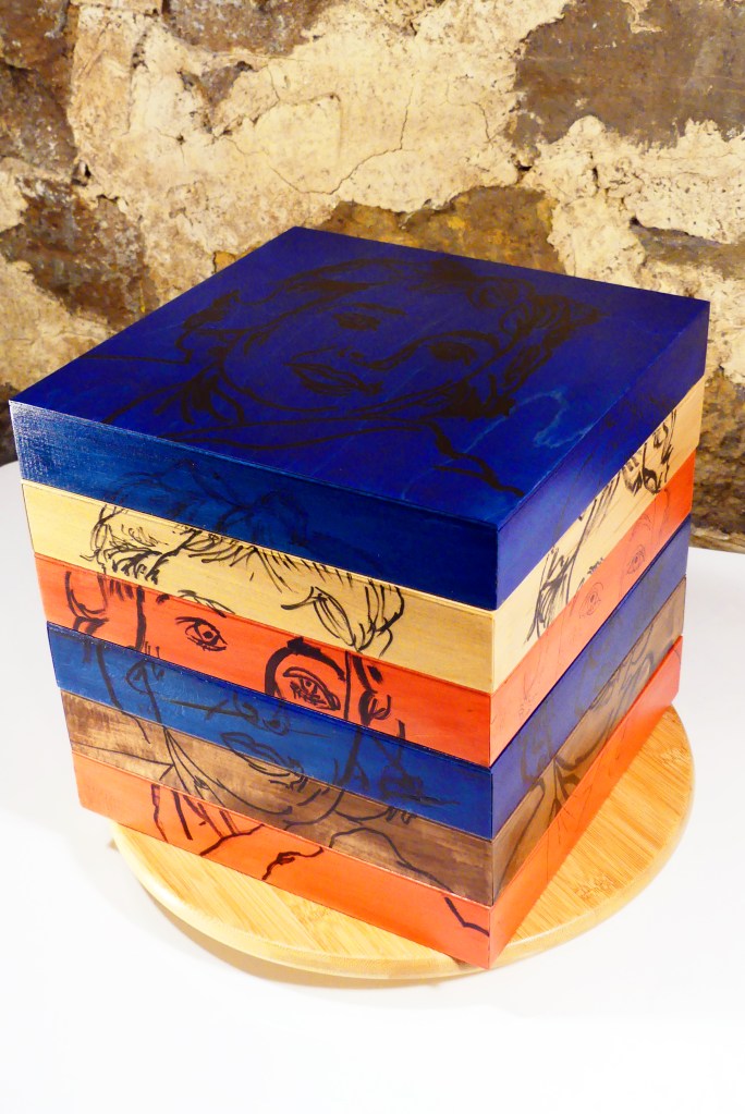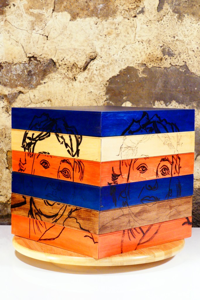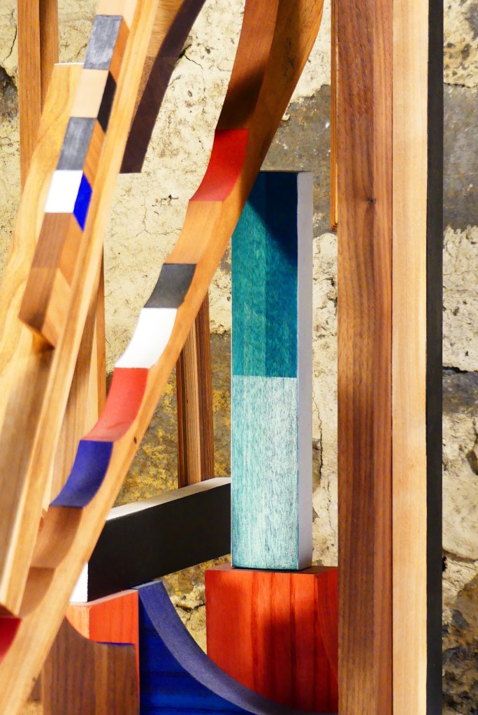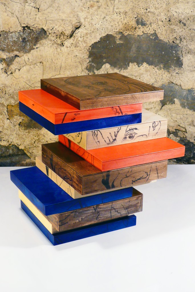 Frêne, chêne blanc, chêne rouge, peuplier, merisier, érable, acajou du Honduras, noyer noir américain, hêtre, contre-plaqués, placages, panneaux de fibres de bois, acryliques, aluminium, cuivre, zinc, acier, colles, vernis, encres, clous. (dimensions variables, bois massifs recyclés)
